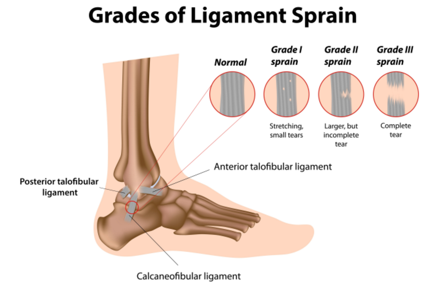 The most common ankle sprain is the inversion ankle sprain, in which the outside ligament in the front gets stretched or sometimes ripped. If it’s just stretched, it’s considered a grade 1 ankle sprain. If it’s partially ripped but still intact, it’s considered a grade 2. Lastly, the injury is considered a grade 3 when the ligament is completely ruptured. Intuitively, the healing time will vary depending on the extent of it injury.